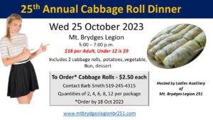 The 24th annual cabbage roll dinner hosted by the Mt. Brydges Legion Ladies Auxiliary will be held on Wednesday 25th October. $15/adult and $7/under 12, includes 2 cabbage rolls, potatoes, vegetables, bun and dessert