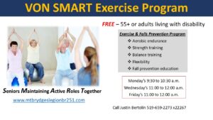 The VON SMART (Seniors Maintaining Active Roles Together) runs every Monday  Wednesday and Friday.  It is for individuals 55+ or adults with disabilities.  Stay fit and active - program includes aerobic endurance, strength training, balance training, flexibility and falls prevention education.  Mondays 9:30 to 10:30, Wed & Fri 11:00 to 12:00.