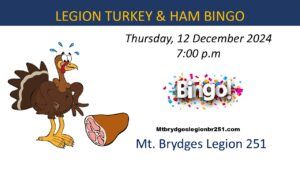Joins us for Legion Turkey & Ham Bingo & other prizes. 7pm start. Card - 3 for .50 cents Specials 3 for $1.00