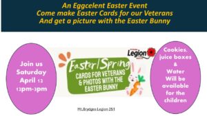 Joins us at the Legion Saturday April 12th  12pm-2:30pm for a special afternoon of Easter fun and gratitude. Let's get creative and make Easter cards to spread joy and appreciation to the Veterans at Parkwood Hospital. WE WILL HAVE ALL THE CRAFT SUPPLIES YOU WILL NEED The Easter Bunny will be there for photos!!   […]