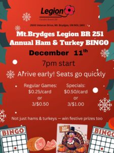 Join us on December 11 at 7:00 p.m. for our Annual Ham & Turkey Bingo! It fills up fast, so arrive early to grab your spot. Enjoy regular games, specials, and a jackpot—plus fun holiday bonus prizes along with the hams and turkeys. A great night of community, excitement, and festive cheer Regular Games:• $0.25 […]