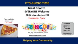 Monday at 1:00 p.m. Bingo is now available for anyone who wants to play. And who doesn't like BINGO. The proceeds go helping the Mt. Brydges community. Pop, chips and coffee is available. Pizza is brought in around noon and players can purchase a slice for $4.00. You are welcome to bring your own lunch. Contact Louise Comeau 519-282-8920 if you have any questions. 3 cards for $15 ~ 4 cards for $20 ~ 7 cards for $30 ~ 8…
